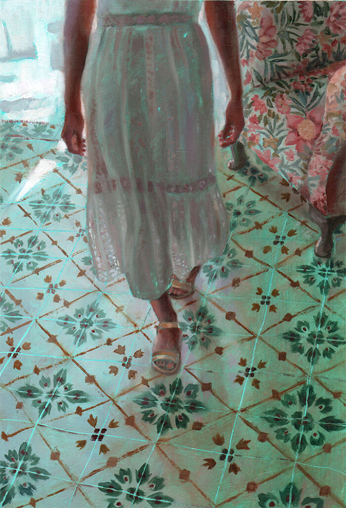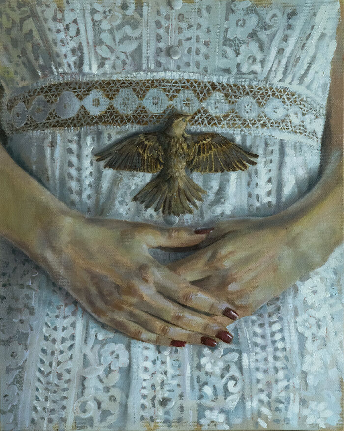 There is no beginning and no ending to the narrative of these fragmented episodes that the artist shares through each artwork. One is only left with questions, and it is all up to the individual’s interpretation. The scenes are all happening in the familiar interior of a Maltese house, and the unexpected intruding birds are reminiscent of a personal event experienced by the artist, which affected him a lot.