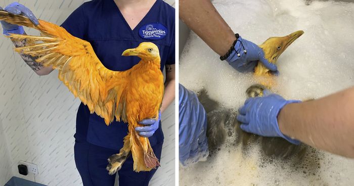 “Our veterinary team bravely bathed the gull (now named Vinny after a Vindaloo curry) to clean off his feathers. He managed to cover them in curry water but eventually did let us scrub him clean.” Vinny really does look great, despite looking mildly annoyed over being bathed.