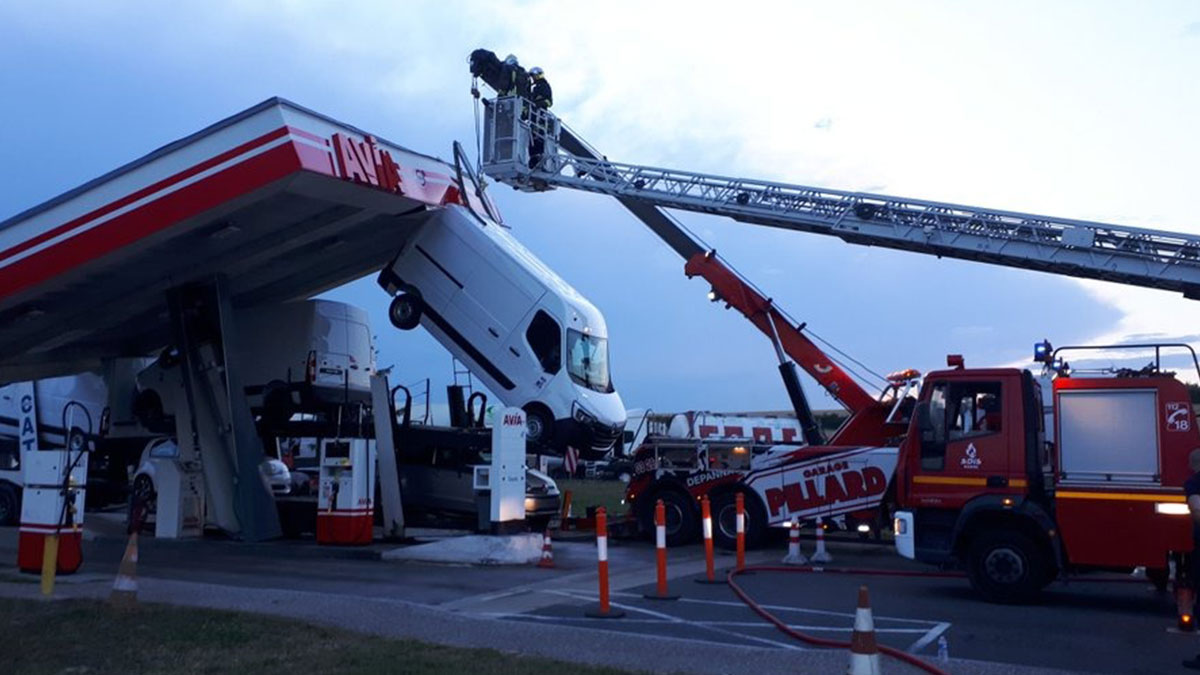 Delicate Evening Operation On The A4 Highway At The Valmy Rest Area. A Heavy Truck Transporting Utility Vehicles Crashes Under The Canopy Of A Gas Station