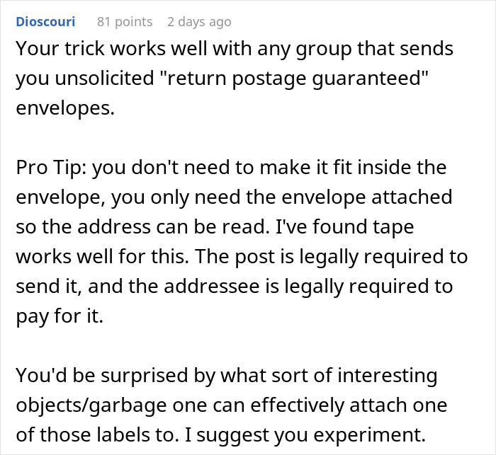 If you’ve been saddled with an incredibly predatory, long-term subscription and you’re told to send the company prepaid envelopes every month, you can have some fun with that.