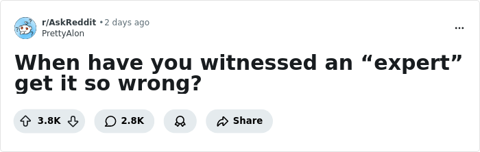 Someone asked “When have you witnessed an “expert” get it so wrong?” and people shared their stories. Be warned, a lot of these deal with medical issues that can get rather graphic. So settle in as you scroll though, upvote your favorites and be sure to add your own tales to the comments down below.