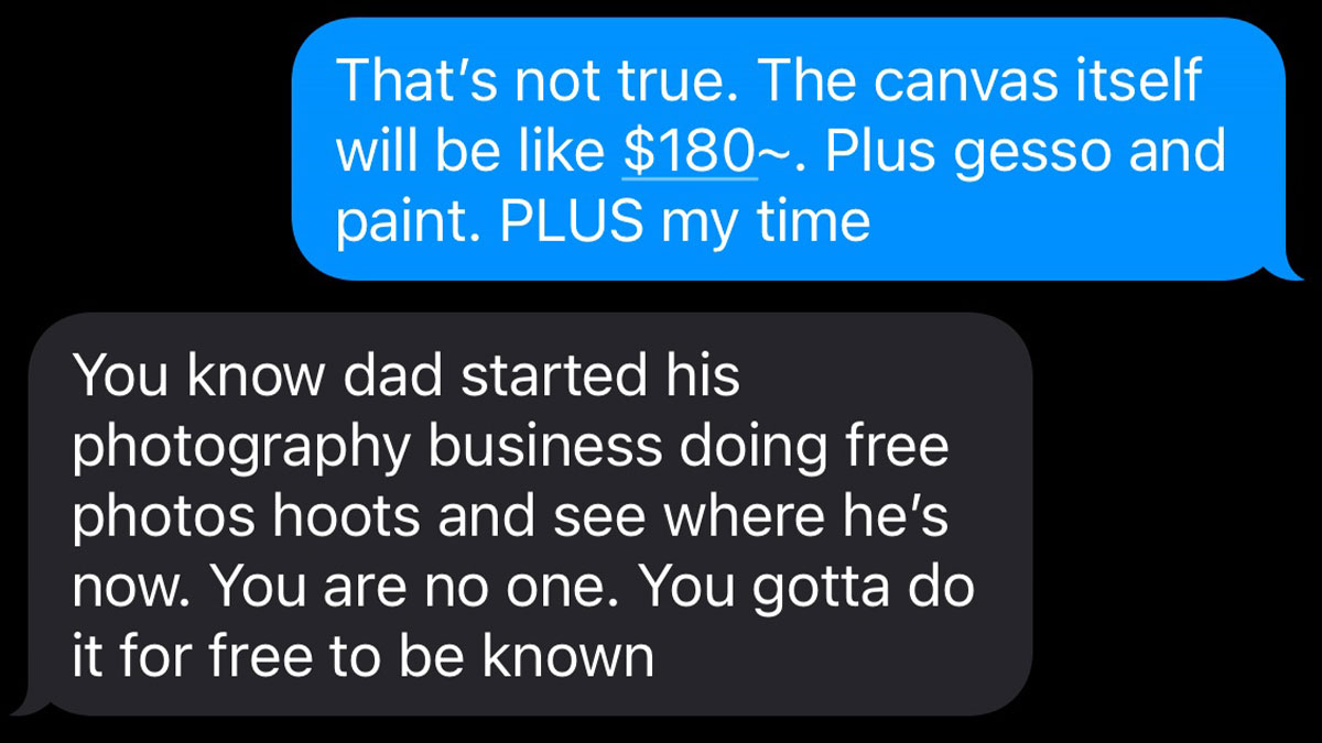 One upcoming artist was excited when a woman asked her to do a painting after seeing her work on social media. But things soon turned sour when the client, an “influencer,” told her that she expected the painting for free. She claimed that the “exposure” was worth more than the art, adding that the artist should actually pay her $200 to post it on her social media channels. The artist decided to do some exposure of her own and outed the influencer by sharing screenshots of the conversation with family and the public.