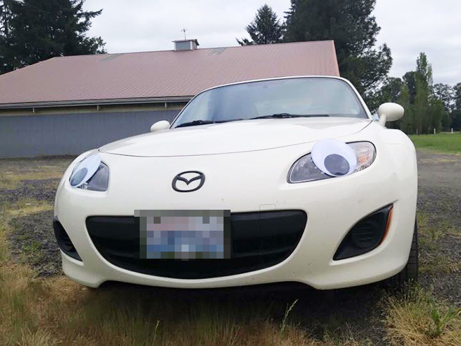 The white car's tail light is giving him a Rudolph nose to go with the googly eyes.