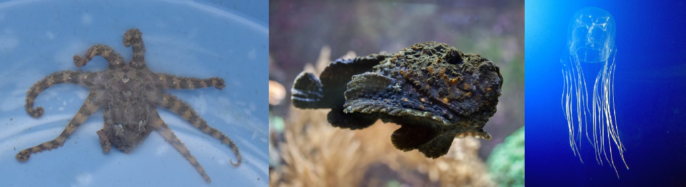 Sharks - same as bears, you wanna look as big as you can so they think you wont fit into their mouth however they are not agressive creatures. And unless absolutly necessary dont try to swim away from them. Even the best swimmer of the world is as fast as r******d seal and those are sharks favourite food.