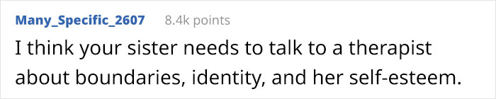 While the new dad’s parents were relieved, the man’s sister pulled him aside and asked why they changed it. The man explained that it was never a sincere choice. This enraged the sister, who had adopted the name for herself and already had her friends calling her by that name due to feeling a connection to it.