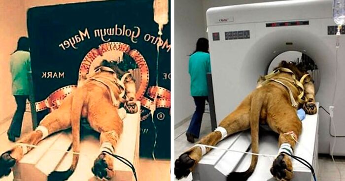 A photo of a lion strapped onto a machine in order to make the iconic MGM intro of a lion roaring is actually a photo of a lion being diagnosed at the vet's office. Luckily, the lion made a wonderful recovery and is now completely healthy. Also, an interesting fact is that there have been 7 lions that were used to create the MGM intro, the current one, who's name is Leo, has appeared in most of the movies since 1957.