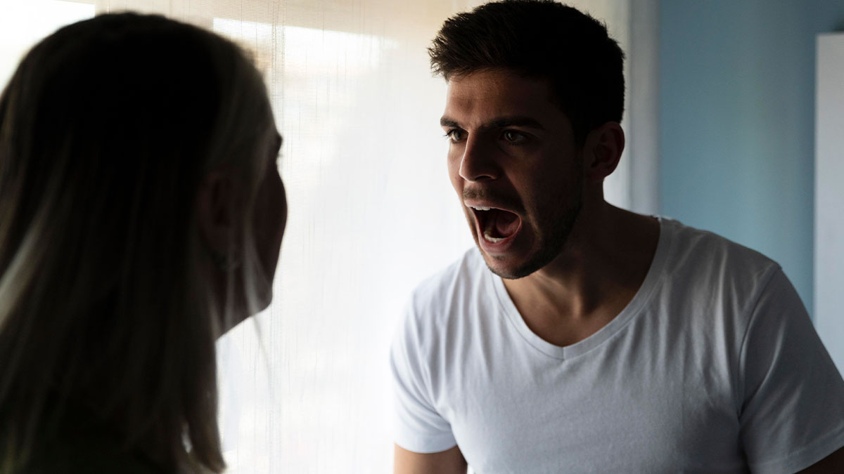 Man angrily confronting woman indoors, illustrating teen forging texts to sabotage dad's relationship and causing conflict.