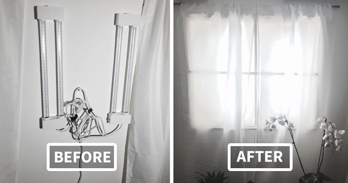All it took was a 2×4 frame with an acrylic cover, some cornstarch, and two LED lamps. The reddit user told Bored Panda that she got a piece of white fabric and dipped that in a cornstarch/water mixture and laid the material over the acrylic and let that dry, to get the matte white look for her crafty idea. Cheap plastic molding was used to create the impression of a frame, and curtains were hung to give the window an “at home” feel. Not only this easy DIY gives the impression that you might see a busy street behind the ‘window,’ but it also creates a very lovely and soft room lightning source.