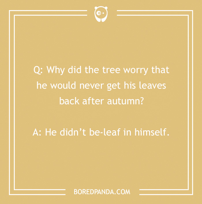 Observing the fall foliage, the chill in the air, oversized sweaters, chunky socks, and drinking hot choco in front of the fireplace really makes the fall season the perfect time to unwind and relax. However, the reduced level of sunlight can lead to a drop in serotonin, a hormone directly associated with mood swings. Thus, cracking jokes about fall is the way to go to increase your serotonin levels without frittering money away on food supplements.