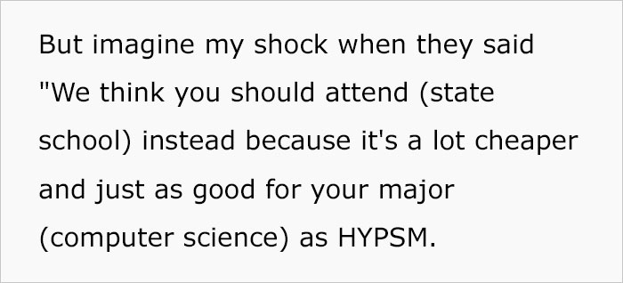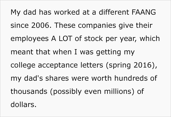 It might seem that now the parents are in a better position financially to be able to provide their daughter with the possibility to go to her dream school. But the man soon understood that back in 2016, his dad already worked for one of the FAANG companies and also had the financials to allow him to go to the university of his choice. This made him really upset, especially when he confronted his parents about this. This all ended in an argument and the narrator’s threat to never speak with them again.