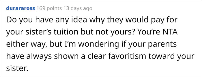 A lot of people online tried to come up with a possible explanation for why his parents decided to help his sister but not him. Some needed more information about the situation as they couldn’t understand why some other options of getting into the university weren’t thought of. Others online suggested that the man should’ve known about their financial situation because they had to provide this information when he was applying for a federal loan to attend a state university. The narrator replied by saying that at that time, he didn’t think about it too much and that his parents took care of that part of the documentation.