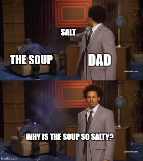 I was making a large amount of loaded potato soup, in an 18qt turkey roaster. My dad would wait until I had left the kitchen so it could simmer and thicken and add seasonings to it without tasting it. More salt here, more pepper there... until he finally decided it wasn't thick enough and added some mashed potato flakes to it. he then had the AUDACITY to complain it was too salty. I very nearly threw my bowl at him I was so [upset]. Never cooked at his house again.