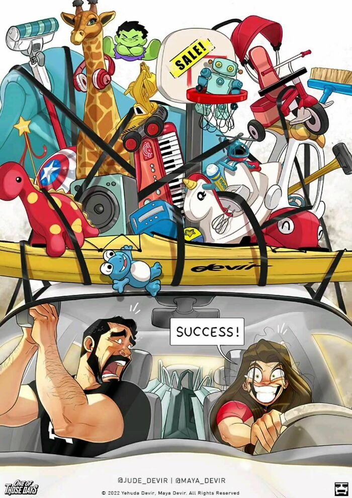 The Tel-Aviv-based couple are parents to two children—daughter Ariel and son Ethan, who just turned two. And to say that the couple’s webcomic is popular is an understatement. They’re a digital sensation! You’ve probably seen their work on social media even if you weren’t aware of the artists wielding the (digital) pens.