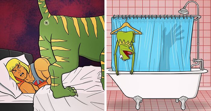 In a previous interview, Ed shared that he doesn't really have a solid concept for this type of art. He just makes things that he thinks are funny and will make people laugh: "Usually, I just think about how life might be different or difficult for these cartoon characters. Like, how Skeletor probably can't drink or whistle since he has no soft tissue or lips around his mouth. Or I like to think about parts of a famous character that we never get to see and what might have been hidden from us all this time."