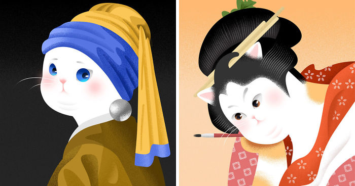 This Chinese illustrator and UI designer Effy Zhang decided to recreate some of the famous paintings with a twist - instead of drawing the people who are originally shown there, he drew our little feline friends. His series "Famous Kitty" features such works as J. Vermeer's "Girl With A Pearl Earring," "American Gothic" by Grant Wood, or Leonardo da Vinci's "Lady With An Ermine." Scroll down to see more!