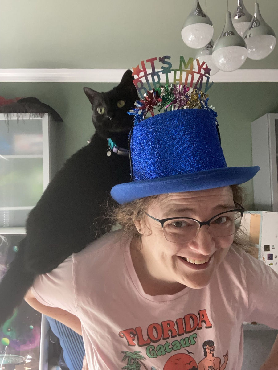As a comparison, here is a photo of me last weekend on my 44th birthday. It's not a high-quality photo (front-facing phone camera with a wiggly cat on my shoulder) but it's a relevant comparison of a "normal woman" in her 40s with Kelly's "wṫf why??" in her 40s. (photo attached to below comment)