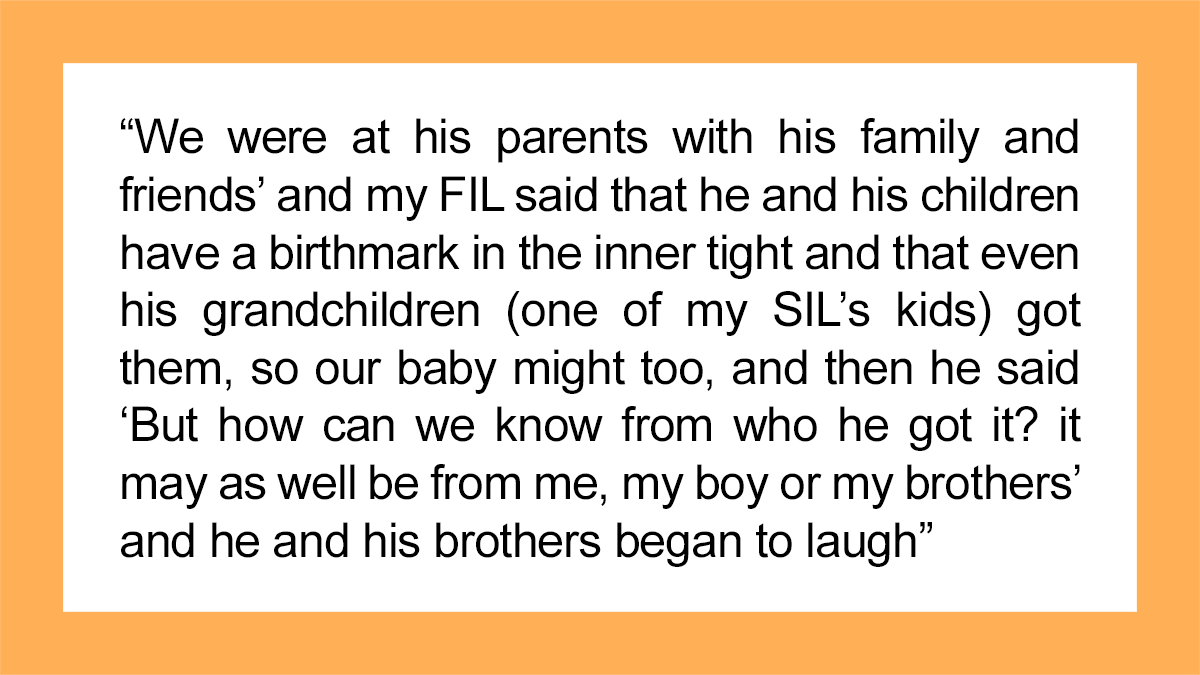 Naturally, the mother-in-law got very defensive, saying that she only wanted to make sure and that she was thrilled to be a grandmother. However, another time, when OP and her partner visited his parent’s place, things went rather south. The woman’s FIL was talking about how he and his children have a certain birthmark that even his grandkids have managed to inherit, wondering whether this baby will be born with one too. But the cute talk was quickly interrupted with a “but how can we know from who he got it?”, reminding everyone about the woman’s former job.