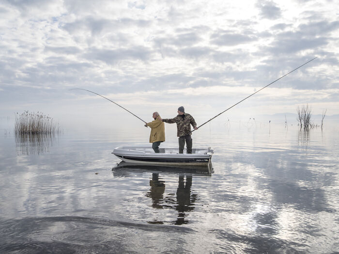 Giving more details regarding the series featuring parents with their children, the photographer continued the story about his fishing ritual with his own father: “For over a year, ever since my mom gave my dad a little fishing boat, this has been our Sunday routine – my father and I, alone or sometimes with friends, head out to Lake Trasimeno. It’s a day just for us, a day of waiting, of talking, and of long silences. Luckily, the bursts of good cheer over the catch of a fish aren’t too few or far between.”