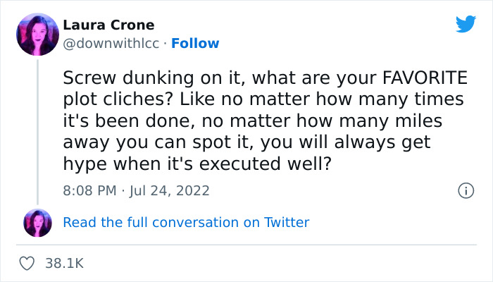 Laura, who started the viral thread, was kind enough to share her perspective on cliches with us, and gave an insight into what sparked the idea for the Twitter post in the first place. Bored Panda also wanted to get to grips with cheesy tropes a bit better, so we got in touch with Doug Murano, who told us why audiences enjoy structure and shared his thoughts about originality in stories. Doug is a Bram Stoker Award-winning editor, as well as the founder of Bad Hand Books. Read on for both interviews.