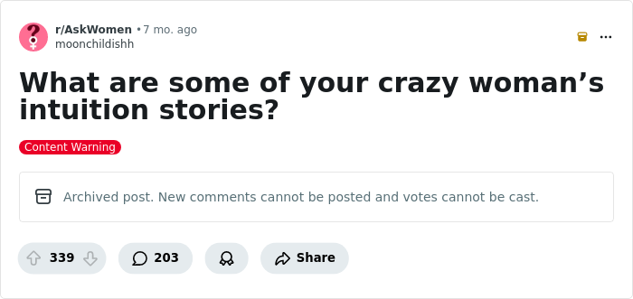 Cannot begin to tell you how many people dismiss intuition. Those people can stfu. It annoys me when they gaslight and then the premonition becomes reality and they still deny. Always trust your gut when it tells you something isn't right. Let the others learn the hard way that they are dumb