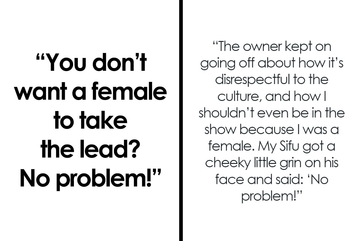 “Honestly, in the moment of it happening, I didn’t know how to react,” the OP recalled. “That was the first and only time I had to face discrimination within my practice, and I felt bad that my Sifu had to be the one to take the brunt of it happening. However, after the fact, it upset me that gender discrimination is still happening to women. We were there to have fun and spread love and happiness to people, and yet someone still found a way to bring in negativity and make a problem out of something that had nothing but loving and welcoming intentions.