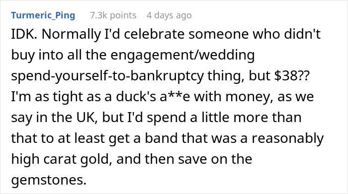 Load More Replies...It's not the $38. It's the $38 from Temu. If MrTribble got me a $10 ring from a flea market stall because he genuinely loved it, I'd be thrilled. Getting it from Temu says "It may poison you, I don't care, it will probably not last, I don't care", and most importantly, "I see you're upset and want reassurance, I don't care". So, he's telling you the terms on which he has graciously offered his hand in marriage. And THAT'S THE MESSAGE he's delivered, which is why he's so content with himself.
