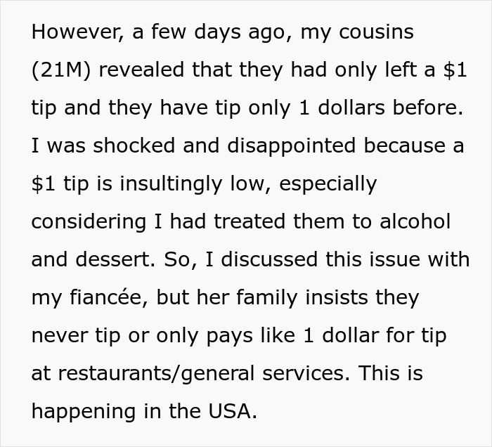 Load More Replies...If OP marries his fiancée, this cheapness on the in-laws part will escalate. I agree with the above posters who said fiancée *knew* her parents were not tipping + said NOTHING to OP. He needs to rethink this whole engagement.