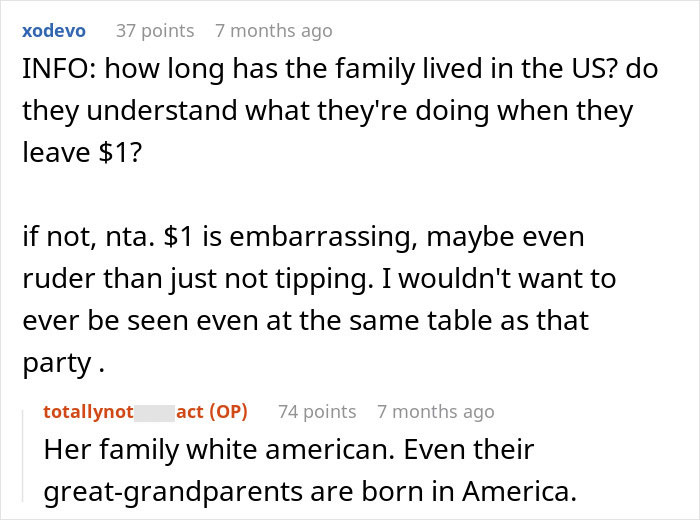 The OP was floored when he discovered this cheap tipping habit wasn’t a one-time slip – it was the family’s standard practice. If you’re rolling your eyes right now, you’re not the only one. I’m pretty sure our OP was too. He had had enough and told his fiancée he wouldn’t be treating her family to dinners anymore.