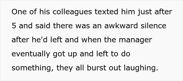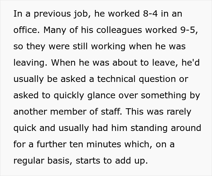 Many commenters raised the concern that what the company was doing might be considered wage theft. The author clarifies that this wasn’t the case. “He was salaried so wouldn’t have lost money, but the additional fifteen minutes would build up and could help him out if something unprecedented came up that caused him to be late for work, like one of our kids being unwell.”