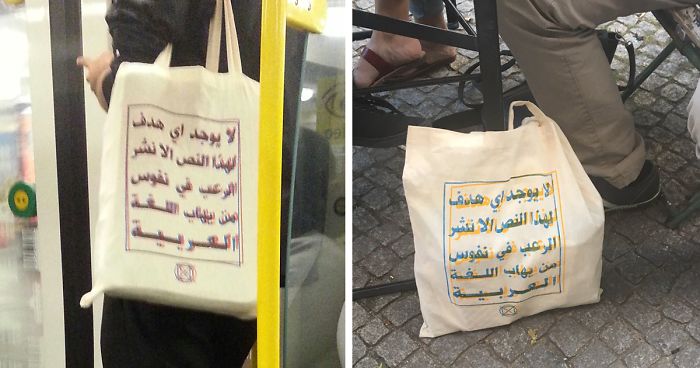 Just recently, journalist Nader Al-Sarras was riding the metro in Berlin, when he spotted this bag designed by Rock Paper Scissors. It reads: “This text has no other purpose than to terrify those who are afraid of the Arabic language”. Genius, huh? Nader thought so too, so he took a picture and posted it to Facebook. It has gone viral since, with over 35k likes and 15k shares.