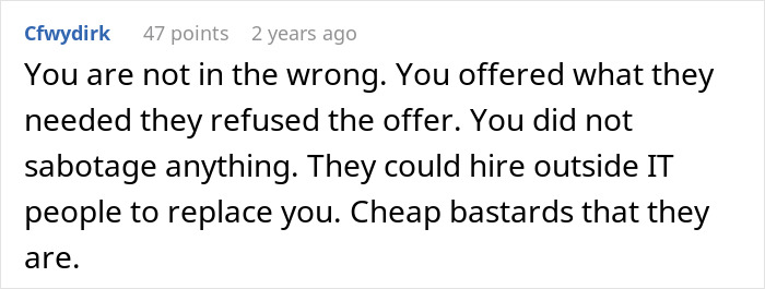Later, the managers realized that the program wasn’t fully automatic and, in fact, required someone to look after it. Since Wintertodt hadn’t trained anyone, they were the only one who could do it. Still, the worker and their former employer couldn’t come to an agreement on how to proceed.