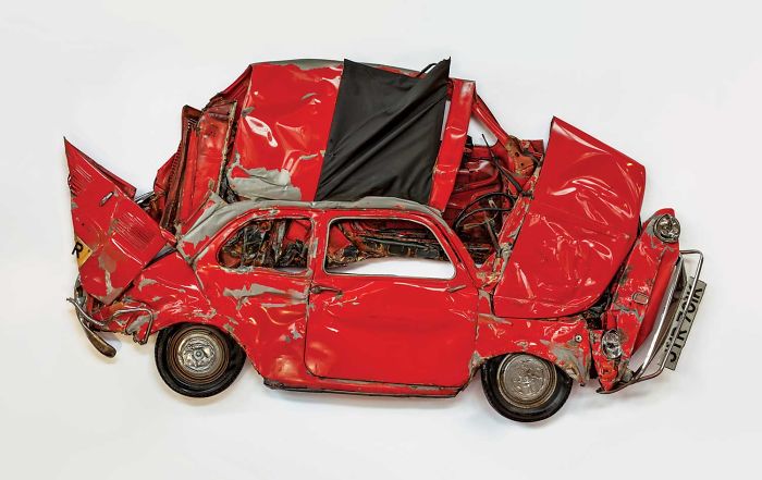 Ron Arad’s wall-mounted car sculptures mesmerize as they play between two and three dimensions. His current exhibition contains different beautifully crushed retro Fiats, “Pressed Flowers.”