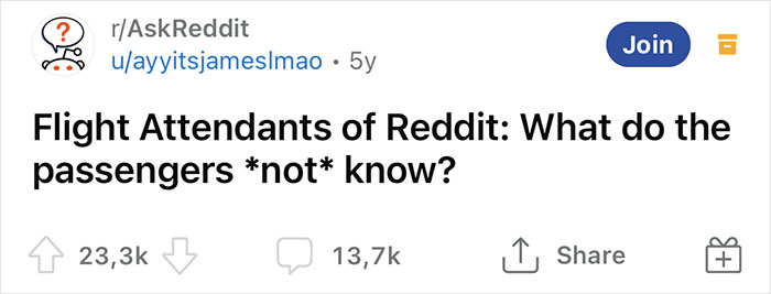 Okay, I have no idea what it’s like to be a flight attendant, so I’m very curious about the mysterious world of the airline industry. Luckily, Reddit user Ayyitsjameslmao reached out to flight attendants asking, “What do the passengers not know?” So today, we can learn some juicy secrets from insiders. We’ve gathered some of the most interesting and eye-opening responses from flight attendants to share with you all, as well as an interview with B, host of The Flight Attendant Podcast, so the next time you take a trip you'll know exactly how to get the best service. Enjoy this list of industry intel, and be sure to upvote your favorite responses. Then if you’re looking to learn even more from flight attendants, check out Bored Panda’s last piece on the same topic right here.
