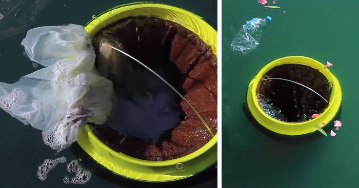 This floating rubbish bin can collect plastic bottles, paper, oil, fuel, and detergent floating in the ocean