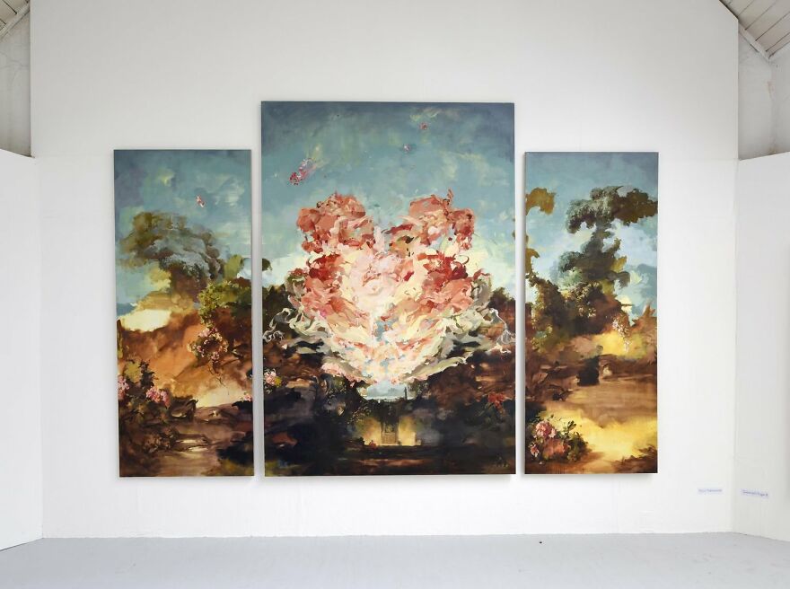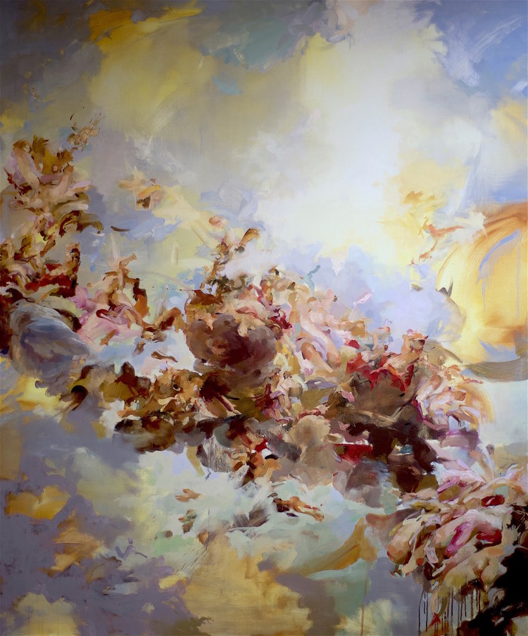 Flora Yukhnovich’s glorious paintings are coded with art history. They offer glimpses of figuration in an otherwise abstract assemblage of brushstrokes, recalling the light, palette and formal considerations favoured by Rococo giants such as Jean-Honoré Fragonard and François Boucher. This strange sense of familiarity—conceived on a grand scale—asks questions about how and why we read a painting, as well as exploring the expressive materiality of paint itself.