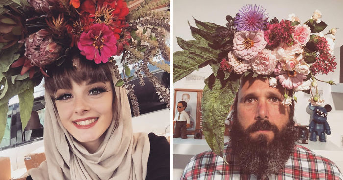 Baron began creating bouquets of flowers grown by his students at Muir Ranch, an esteemed school garden at Pasadena’s John Muir High School. He then takes these unique bouquets with him to all manner of public places, convincing friends and total strangers to be photographed with, well, flowers on their heads.