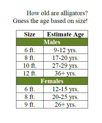so, according to the alligator size guide (real document but from SC, not FL) 9-12 years if a male gator and 12-15 years if a female for social distancing. gator-doc-...c8b9b7.png
