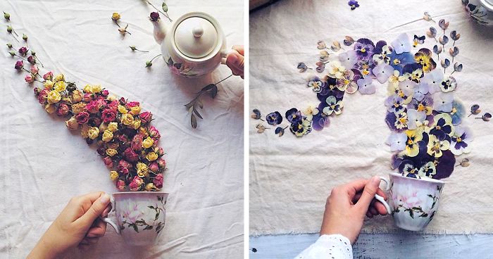 Malinovaya creates her poetic Floral Tea Story photography series using only plants, a tea set, and a tabletop. She cleverly arranges everything to form swirling formations, making colorful floral bunches look like either rising steam or tongue-tickling savory liquid. Additionally, Marina adds some extra sprigs and loose petals to her delicate compositions to make them a bit more whimsical. It's like you can almost taste the images!