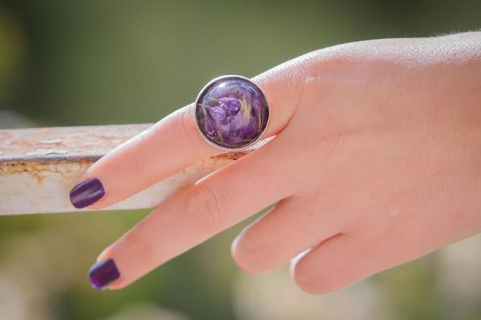 This statement ring has been made from glossy resin and paper base. Flowers are real. It has thick coat of glossy resin. Ring has adjustable base. Diameter of the ring: 2.5cm / 0,9 in