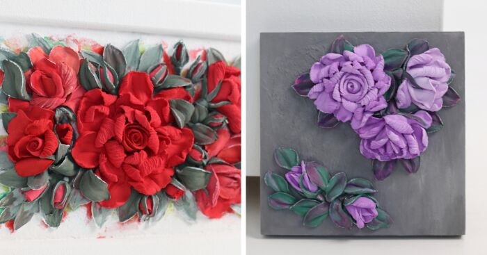 I create floral paintings from decorative plaster using a palette knife. This direction of creativity is called sculpture painting. In the process, decorative plaster is plastic, but after drying it becomes very durable.