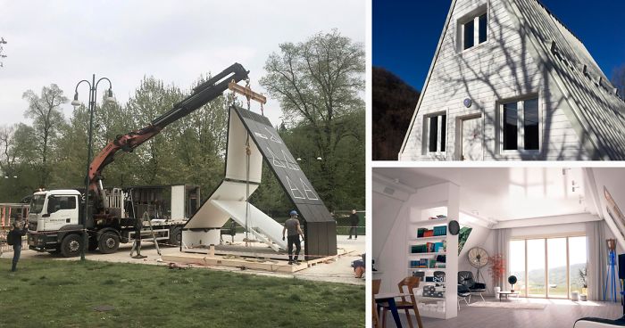 Load More Replies...Yes, three people and heavy machinery. And it doesn't have to be erected on concrete foundations, yet it is clearly shown in the pictures that it is? This looks more like a concept than finished product.