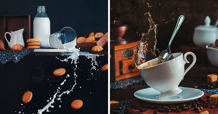 But there’s always a place for something dynamic in still life: just add some falling sprinkles, rising steam or a splash of coffee and watch how these simple things bring your picture to life. That’s what I do. I turn my kitchen into a total mess to make photos of falling cups, flour clouds and spilled milk. You can also check the previous post here to see how it’s usually done.
