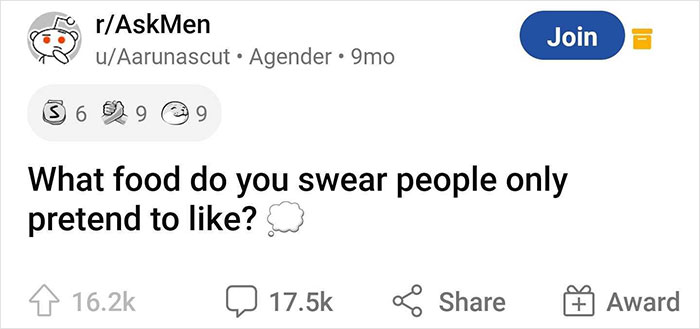 That’s one of the perks of Reddit: you can (semi)anonymously share your real thoughts and feelings on a topic. It’s great—cathartic even—to get the fact that you really hate what most others enjoy off your chest. Redditor u/Aarunascut started up a fascinating thread on r/AskMen, asking people to share the foods that they think people only pretend to like.