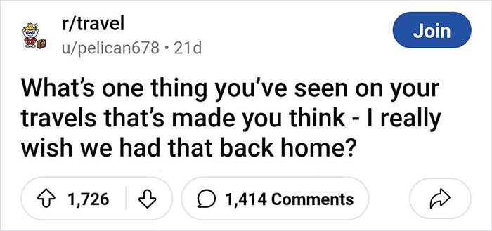 Travelers on Reddit have recently been discussing the things they’ve encountered and experienced around the world that they wish their home countries had. From bidets to well-paved bike lanes, enjoy scrolling through this list, and keep reading to find conversations with travel experts Alyse of The Invisible Tourist and King Siu of Travel, Eat, Drink!