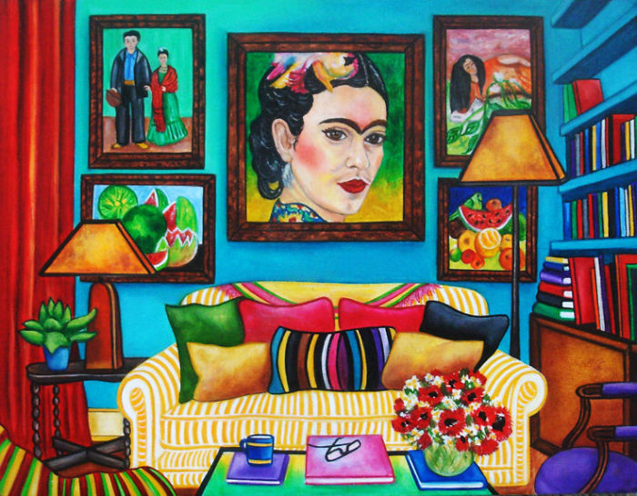 many of her works adorning the walls around her. Paintings, books and flowers surround her in the Mexican themed