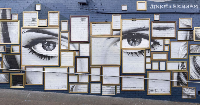 We recently created our second piece of work entitled “Bette”; spanning 28 hours of painting and installation, using a concept and technique previously unseen in the street art movement as we know it. With a combination of spray paint and picture frames, either collected at random or custom made in our studio, we created this mural by placing each frame strategically over the eyes of Bette Davis, in turn creating an elegant composition.