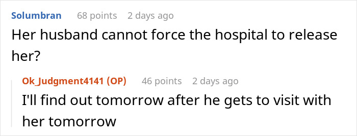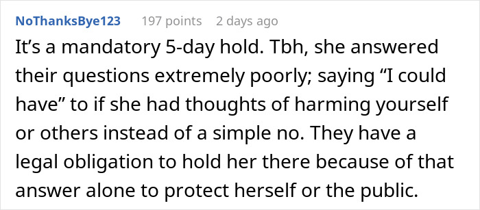 Load More Replies...Where I live, the Police could take her to hospital. However, they would most definitely not put her in handcuffs and placed in a police car whilst she was shouting for her husband. The police would have spent time defusing the situation, and assessing it. IF they felt she needed to be taken to hospital they could do so, but once there, two doctors would need to agree that she needed to be detained. People do not get detained because they 'gave the wrong answer to the police'. Every attempt would have been taken to get the woman to voluntarily agree to remain in hospital. The doctors in the hospital would contact the therapist, and ask for their professional advice. The hospital would also have contacted her next of kin to explain what was going on.