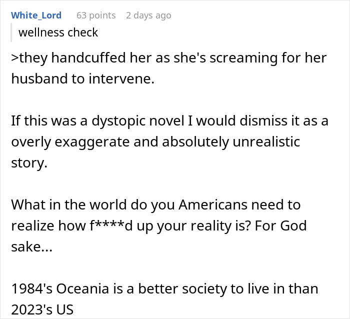 Load More Replies...I once called the police for a wellness check in my country. A friend didn't answer their phone, didn't answer their door and I was sure they were home since we were supposed to meet at that time. What they did: they cane, rang the doorbell, knocked, got a door service to open the door without damaging it, went in and found my friend asleep, totally exhausted. They could wake him up then though. They told him they wouldn't leave until he had someone come over and care for him because he was very sick with high fever, he told me to call his mom who arrived an hour later. They helped us packing a bag for him and accompanied him and his mom to her home, ensuring he was safe and told them to take care and call an ambulance if it got worse. Everyone said thank you and they left. That is how you do a wellness check. What is wrong with America?