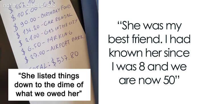 Load More Replies...I don’t see the problem. This isn’t a bill for their stay with them at home. This is an entirely separate trip. Another commenter mentioned exactly that and asked if OP really expected to not share in that extra cost. Her answer was super evasive that (paraphrased ) she didn’t charge her friend anything when they stayed with her. Totally avoided the question. Did her version include a side trip with hotels and related travel expenses too?? Sounds a bit weird
