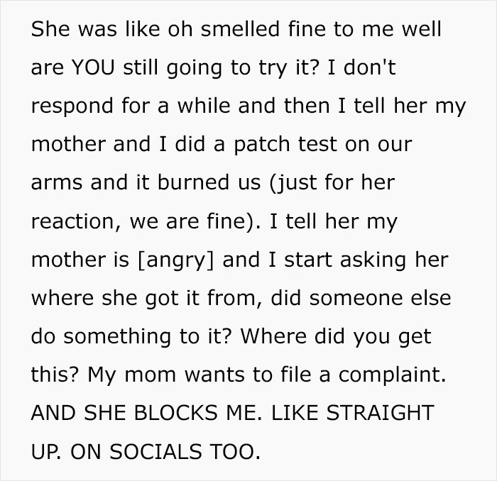 That’s exactly what happened to redditor u/UltraSecretAcc, who barely avoided chemical burns. She has been updating Reddit about an ongoing drama with one of her friends who had secretly put Nair, a hair removal product, into a conditioner she lent her, right before her birthday. Frightened, the young woman turned to her mother, friends as well as law enforcement for help. You’ll find the full story in the OP’s own words below.
